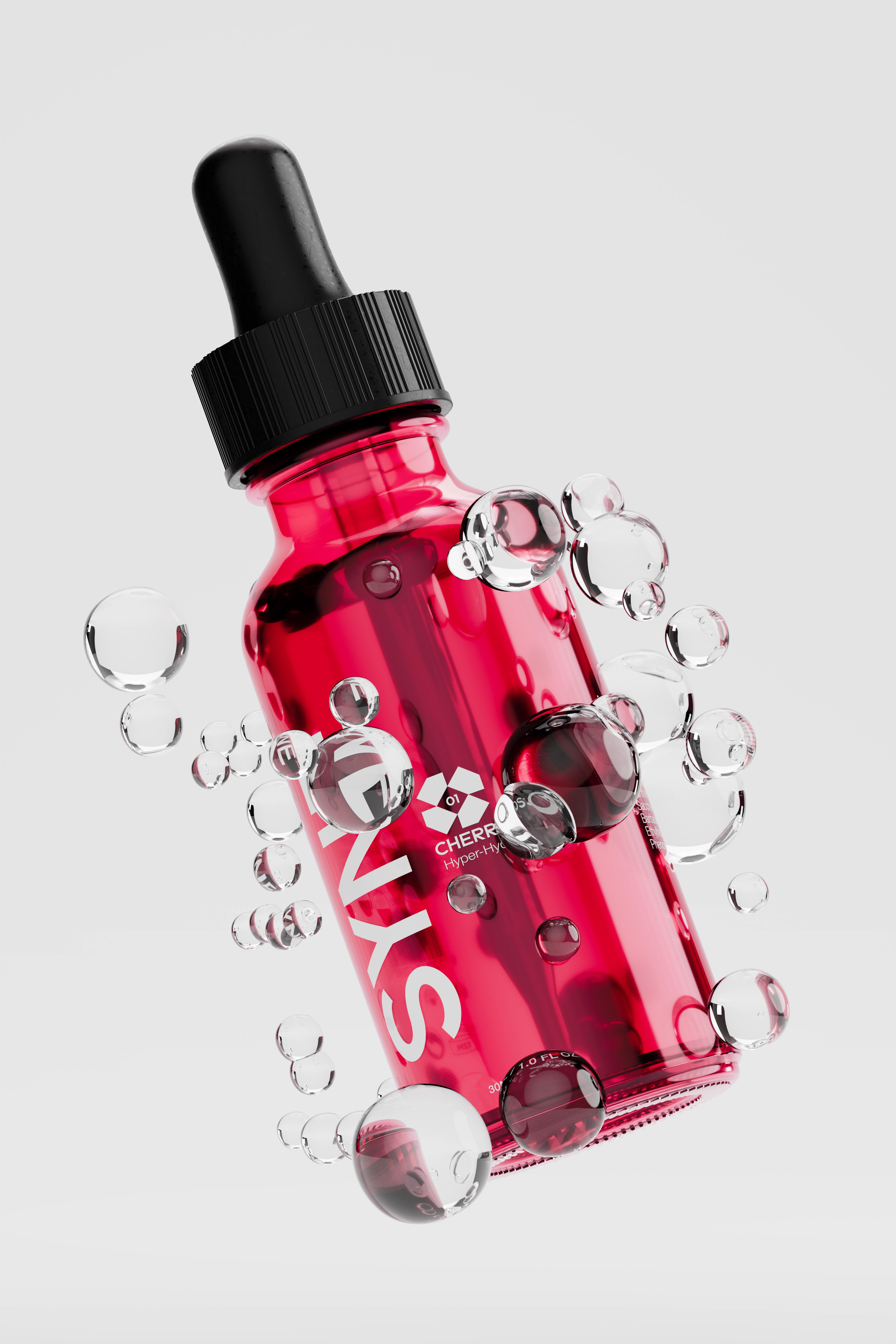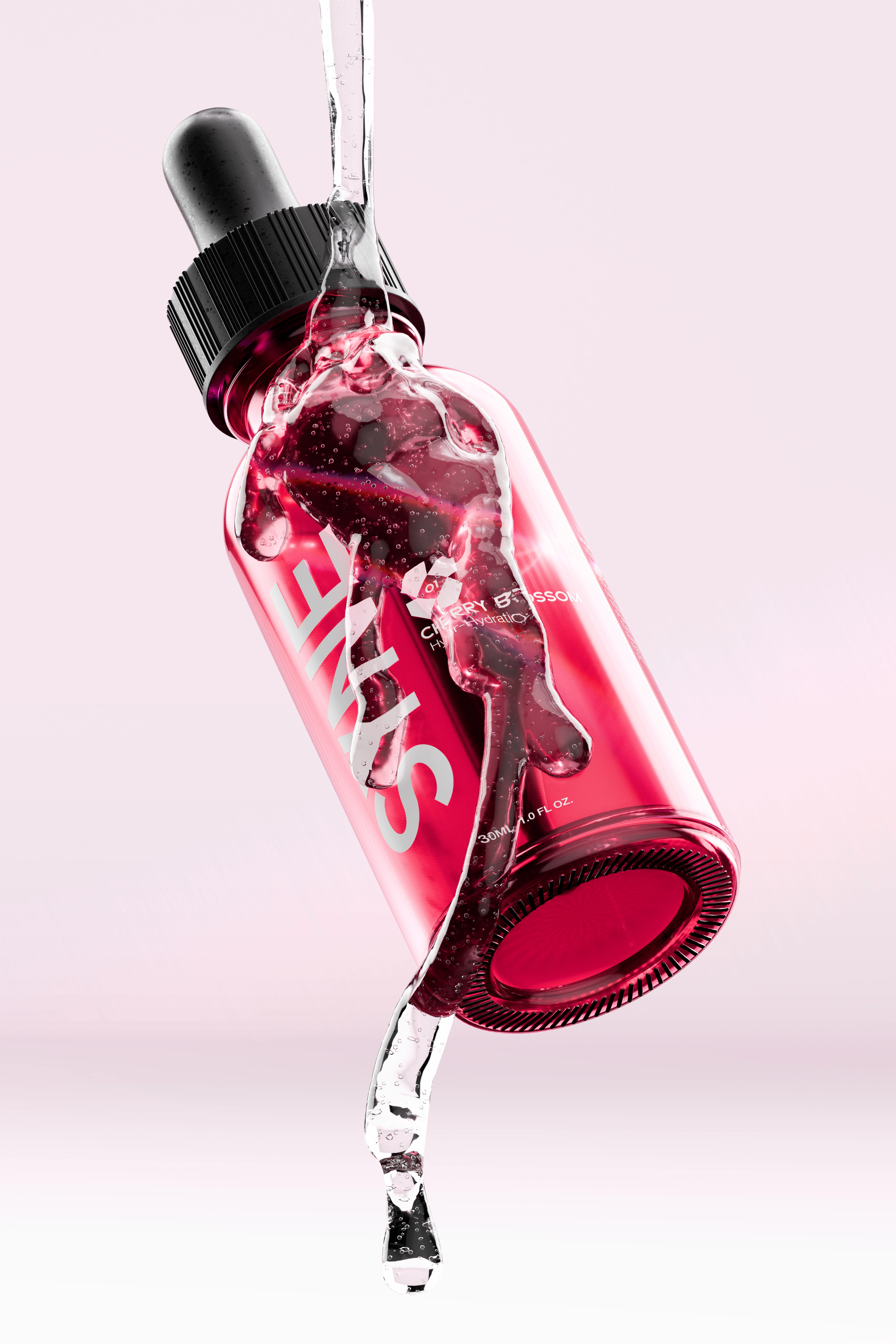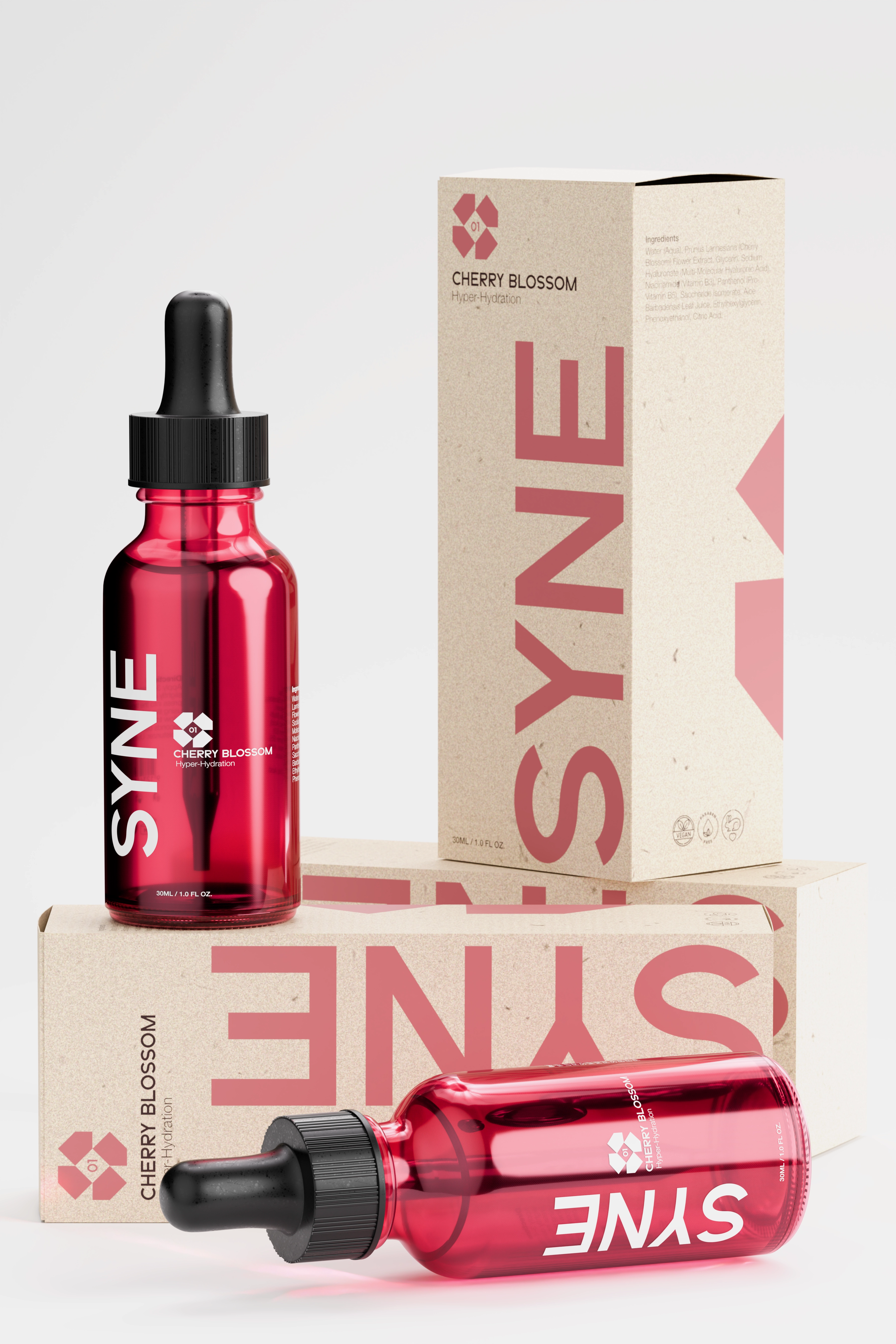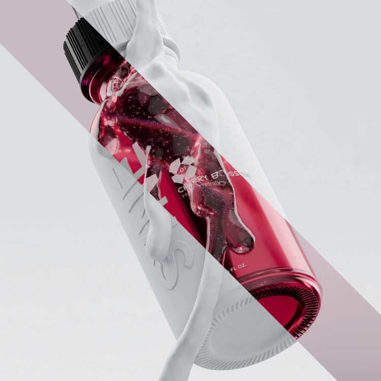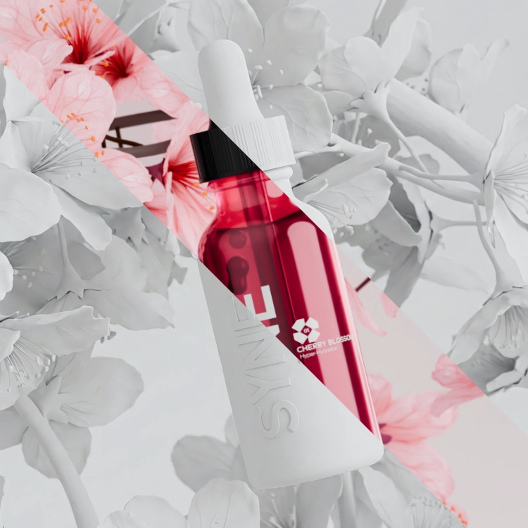 We developed a packaging system that uses a vibrant, translucent red glass to immediately signal the Cherry Blossom active ingredient, contrasted against stark, Swiss-style typography to communicate efficacy. The 3D visualization strategy focused on sensory physics. using liquid simulations to demonstrate the serum’s lightweight viscosity and absorption power, creating a campaign that feels refreshing just to look at.